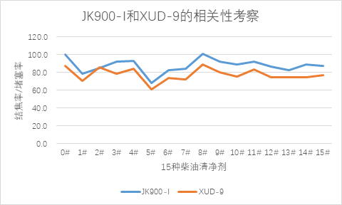 从曲线图中可以看出,JK900-I型柴油清净性试验台架与UXD-9台架的测试结果关联度很高,可以精准的得到数据结果。